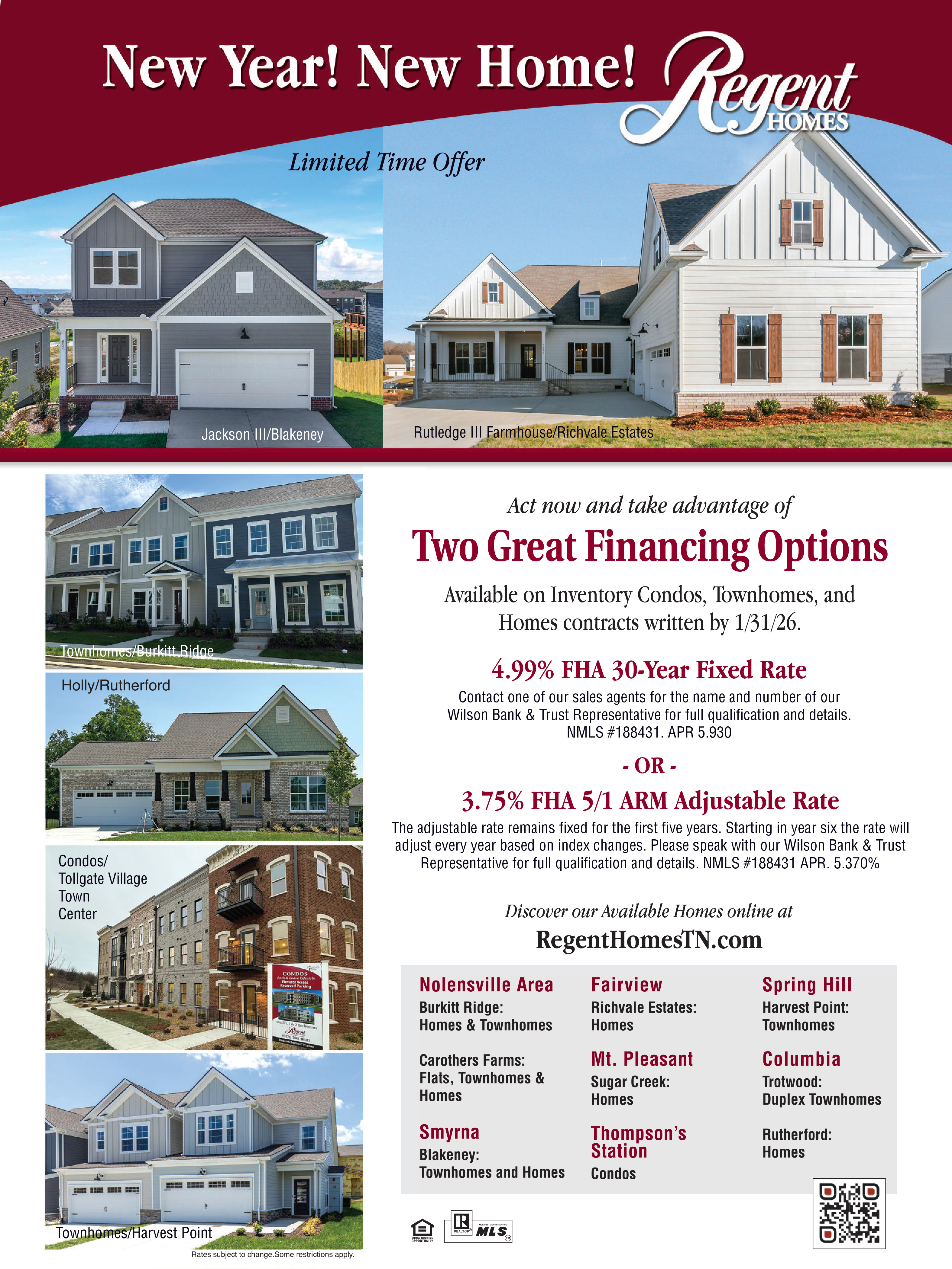 Act now so you don’t miss your chance to be part of this new neighborhood in Columbia, Tennessee. We’d love for you to take a tour and discover all Rutherford has to offer. Visit us online at regenthomestn.com and schedule your appointment today! Your dream home is waiting for you in Regent’s Rutherford neighborhood!